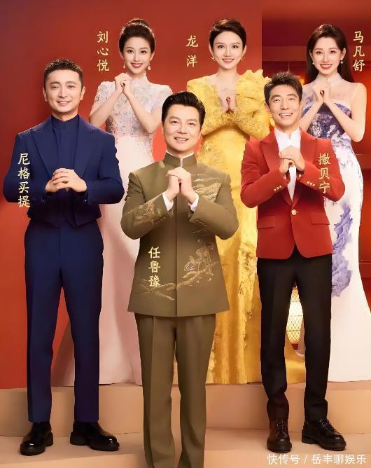 这张海报上,撒老师双手抱拳,身着红色西装配黑色西裤,脸上满是喜悦。旁边的人们都穿着各种各样的衣服,各有特色。马凡舒、龙洋和刘心悦这三位女主持,各自都穿着不同颜色的礼服:粉色、金黄色和紫色,风格各异。
